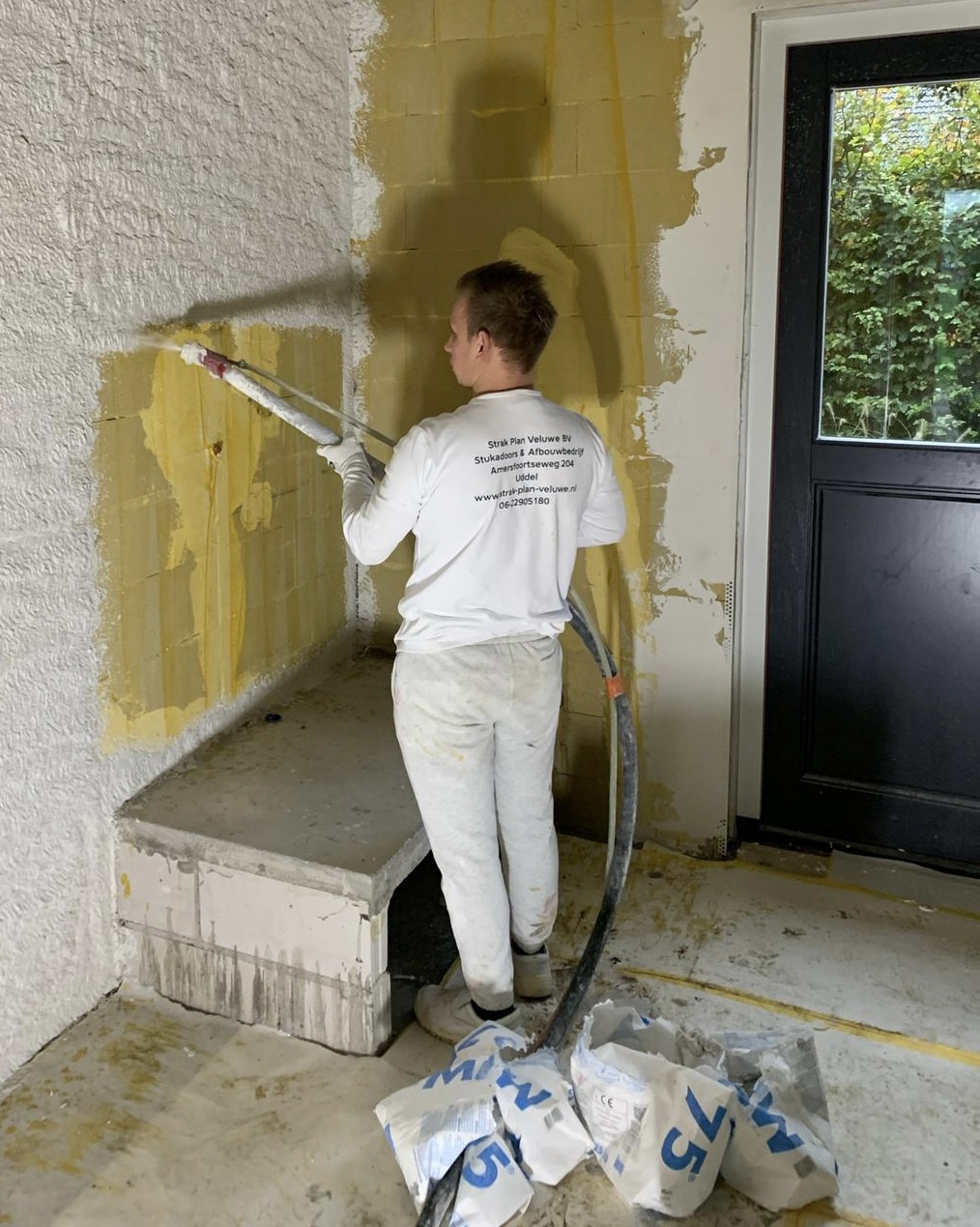 We beginnen met het afplakwerk indien dit nodig is. Om te zorgen dat het stucwerk mooi strak wordt strijken wij eerst de de ondergrond voor met voorstrijk. Het is mogelijk om een sneldrogende voorstrijk te gebruiken zodat we dezelfde dag nog kunnen stucen. Het stucwerk droogt ongeveer 1mm per dag. Wij gaan pas naar huis als u muur strak en egaal is en de klant tevreden is.